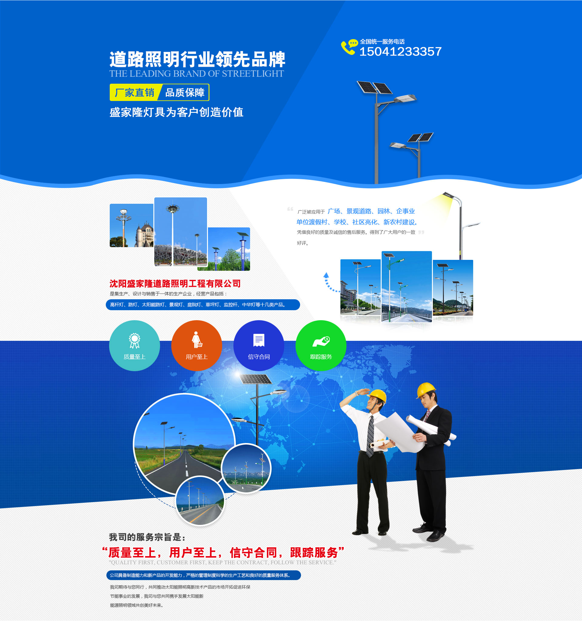 沈陽(yáng)盛家隆道路照明工程有限公司坐落于沈陽(yáng)市于洪區(qū)興盛村愛(ài)國(guó),生產(chǎn)各種室外,道路,廣場(chǎng),車(chē)站,碼頭,橋梁,庭院及室內(nèi)工礦照明燈具,品種有太陽(yáng)能路燈,道路燈,LED路燈,組合燈,景觀燈,庭院燈,草坪燈,彩色泛光燈,中高桿燈以及配套使用的各種路燈頭,鎮(zhèn)流器,觸發(fā)器開(kāi)關(guān)箱等系列產(chǎn)品。